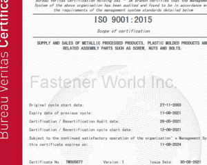 We represent more than thirty qualified manufacturers in Taiwan and sell worldwide. Our policy is to provide Quality Products, On Time with Competitive Pricing and to treat our customers and manufacturers fairly. It is with our excellent fastener and product knowledge, business philosophy, communication skills, and flexible service plans, we work to earn the trust of our customers and suppliers. After building that trust, we continue to work closely with our customers and manufacturers to grow our business together.